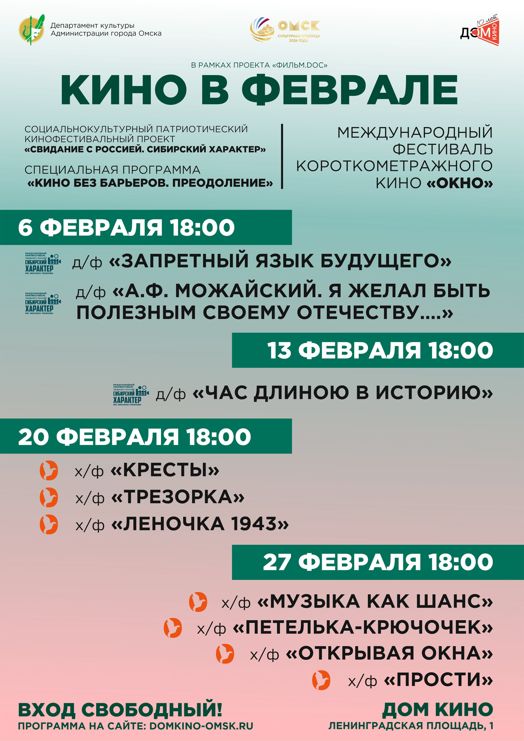 В омском ДОМе КИНО с 6 по 27 февраля пройдут кинопоказы в рамках двух масштабных кинопроектов: специальная программа "КИНО без барьеров. Преодоление" социокультурного патриотического кинофестивального проекта "СВИДАНИЕ С РОССИЕЙ. СИБИРСКИЙ ХАРАКТЕР" и "Эхо" VI Международного фестиваля короткометражного кино "ОКНО".