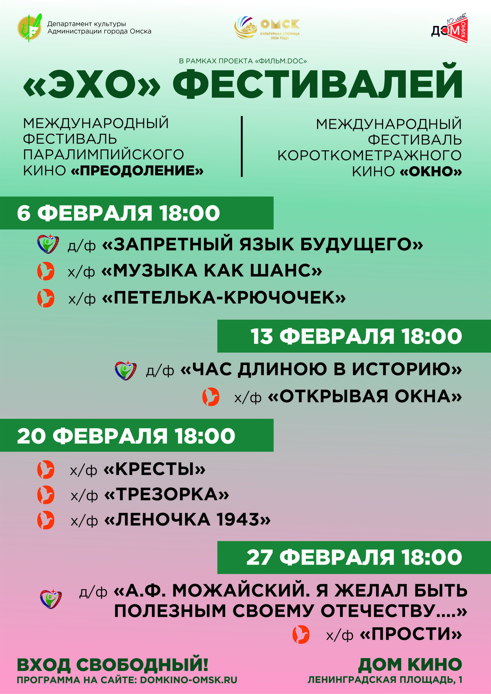 В омском ДОМе КИНО с 6 по 27 февраля пройдёт Эхо сразу двух международных кинофестивалей: VI Международного фестиваля короткометражного кино "ОКНО" и II Международного фестиваля паралимпийского кино "Преодоление", которые состоялись в октябре 2025 года.